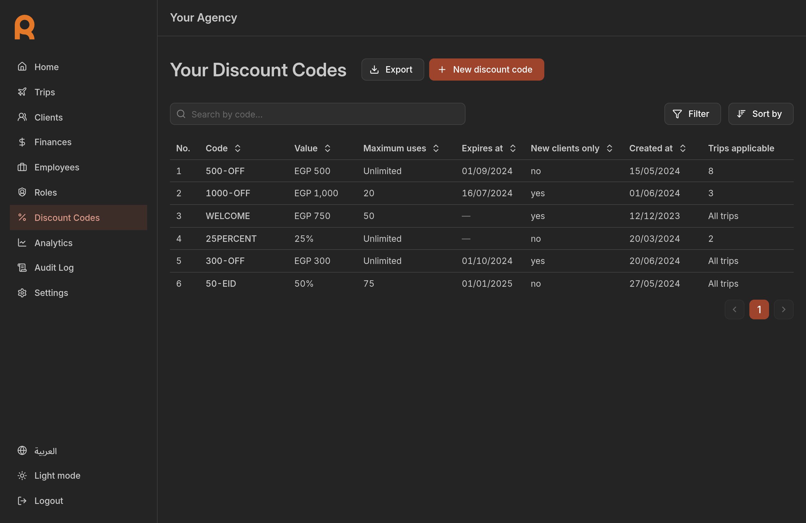 Use this section to manage your promotional campaigns. Whether you want to run a flash sale, reward loyal customers, or incentivize early bookings, discount codes give you the flexibility to do so.