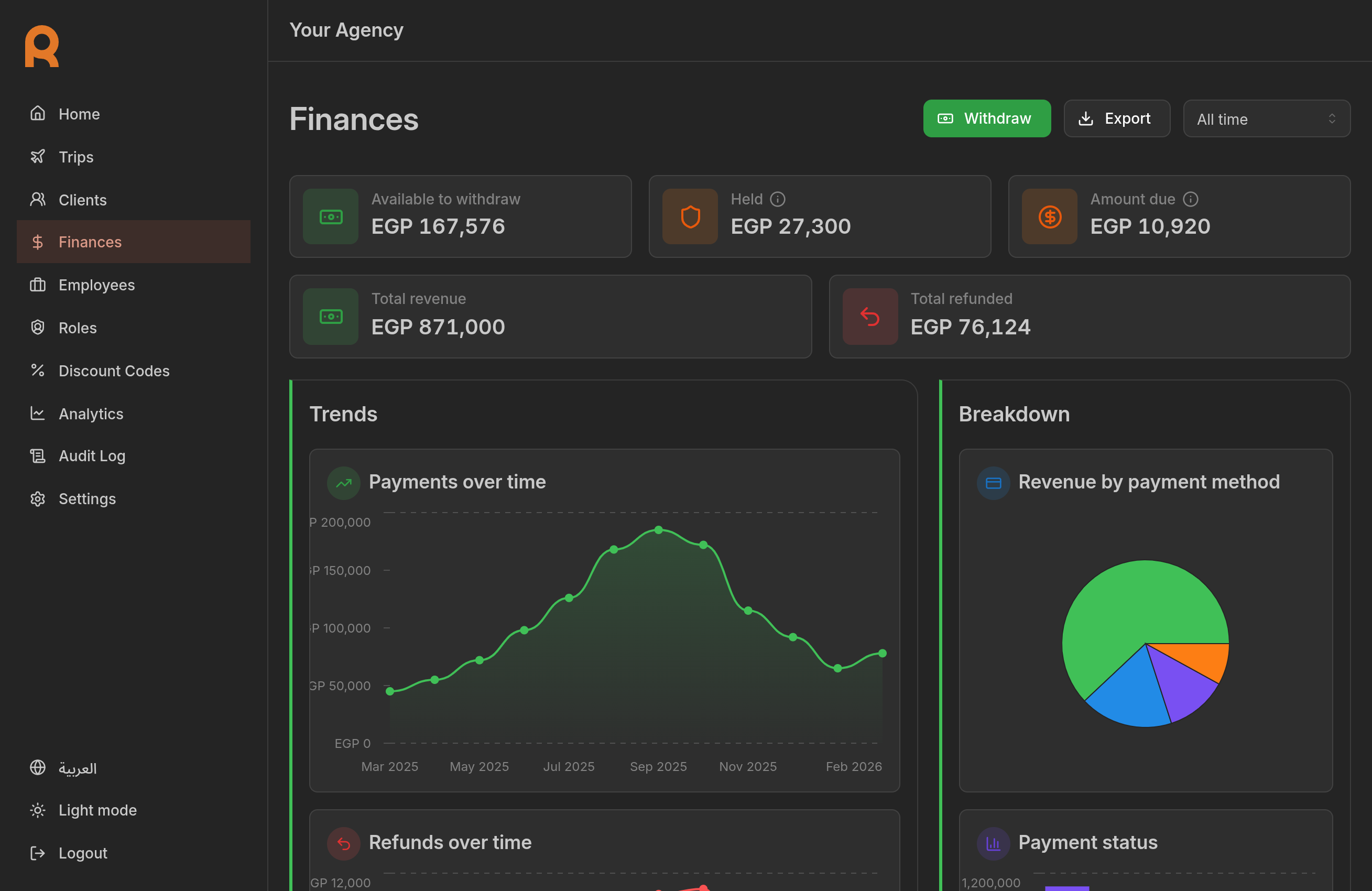 The Finance section provides a complete overview of your agency's financial health. It tracks every payment, refund, and payout in real-time.